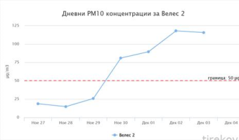 Два дена по ред воздухот во Велес е со концентрации на ПМ10 честички над 100 мг/м3. Според мерните инструменти на Министерството за животна средина на мерното место Велес2, лоцирано во дворот на Детската градинка во населба Тунел, вчера биле измерени средно дневни од 115 мг/м3 а во средата 118 мг/м3. Досега годинава од 337 дена во 59 било констатирано поголема вредност од дозволената 50 мг/м3. Дозволен број денови за Велес е 39.