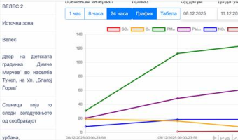 Два дена по ред воздухот во Велес е со концентрации на ПМ10 честички над 100 мг/м3. Според мерните инструменти на Министерството за животна средина на мерното место Велес2, лоцирано во дворот на Детската градинка во населба Тунел, вчера, среда биле измерени средно дневни од 128 мг/м3 а во вторникот 112 мг/м3. Досега годинава од 344 дена во 62 било констатирано поголема вредност од дозволената 50 мг/м3. Дозволен број денови за Велес е 39.