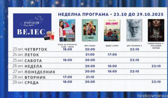Пет филма на репертоарот на Киноверзум Велес, еден премиера „Без каење„, се враќа „ДЏ Ахмет„ но и најгледаните филмови хоророт „Црн телефон 2“ и „Повикување –последен обред“.