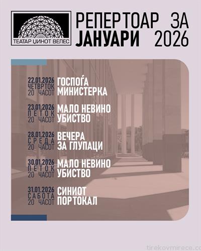 Театарската сезона за 2026 година за актерите од велешки театар „Јордан Хаџи Константинов Џинот“ започнува четврток 22 јануари. И тоа со комедијата на Нушиќ, „Госпоѓа министерка“.