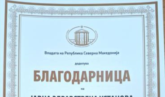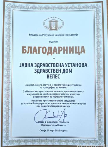 ЈЗУ „Здравствен дом“ Велес доби благодарница од Владата на Република Македонија, која е доделена за „несебичното, стручно и пожртвувано дејстување по трагедијата во Кочани“.